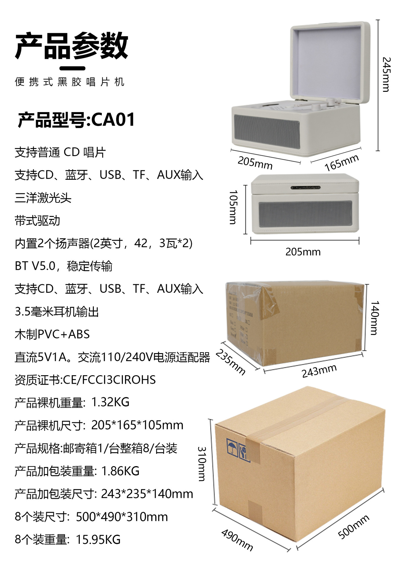 一体CD机×1、充电线×1、遥控器×1、说明书×1、礼盒包装×1