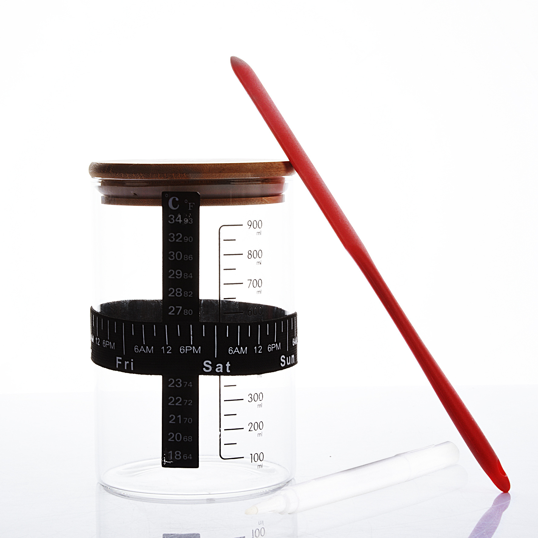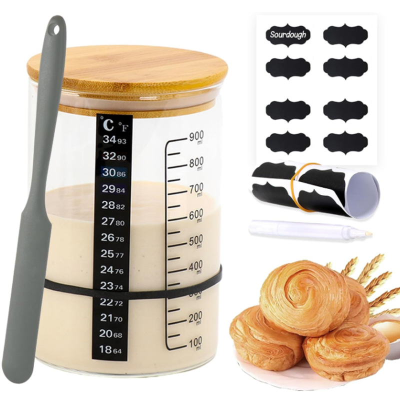 【容量大,使用方便】这款酸面团罐容量为 24 盎司,可制作 3 个酸面包。 您可以轻松地将面粉和水添加到这款宽口玻璃罐中,并在需要时取下启动器。 刮刀有助于*搅拌,温度贴纸可帮助您实时监控起动器的温度。 日期/时间喂食胶带可帮助您跟踪时间。